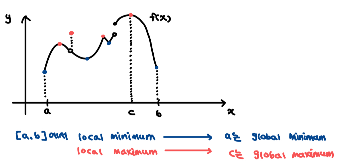 - local maximum : 어떤 값 주변에서 함수를 가장 크게 만드는 점에서의 값 (극댓값)