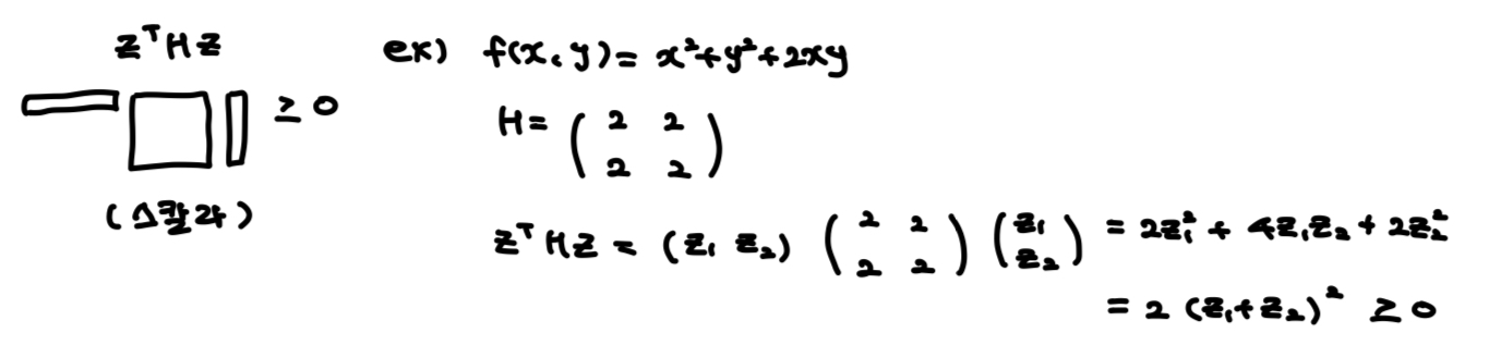 헤시안 행렬이 모든 벡터 z에 대해 Positive-semi definite라면 f는 Convex function이다.